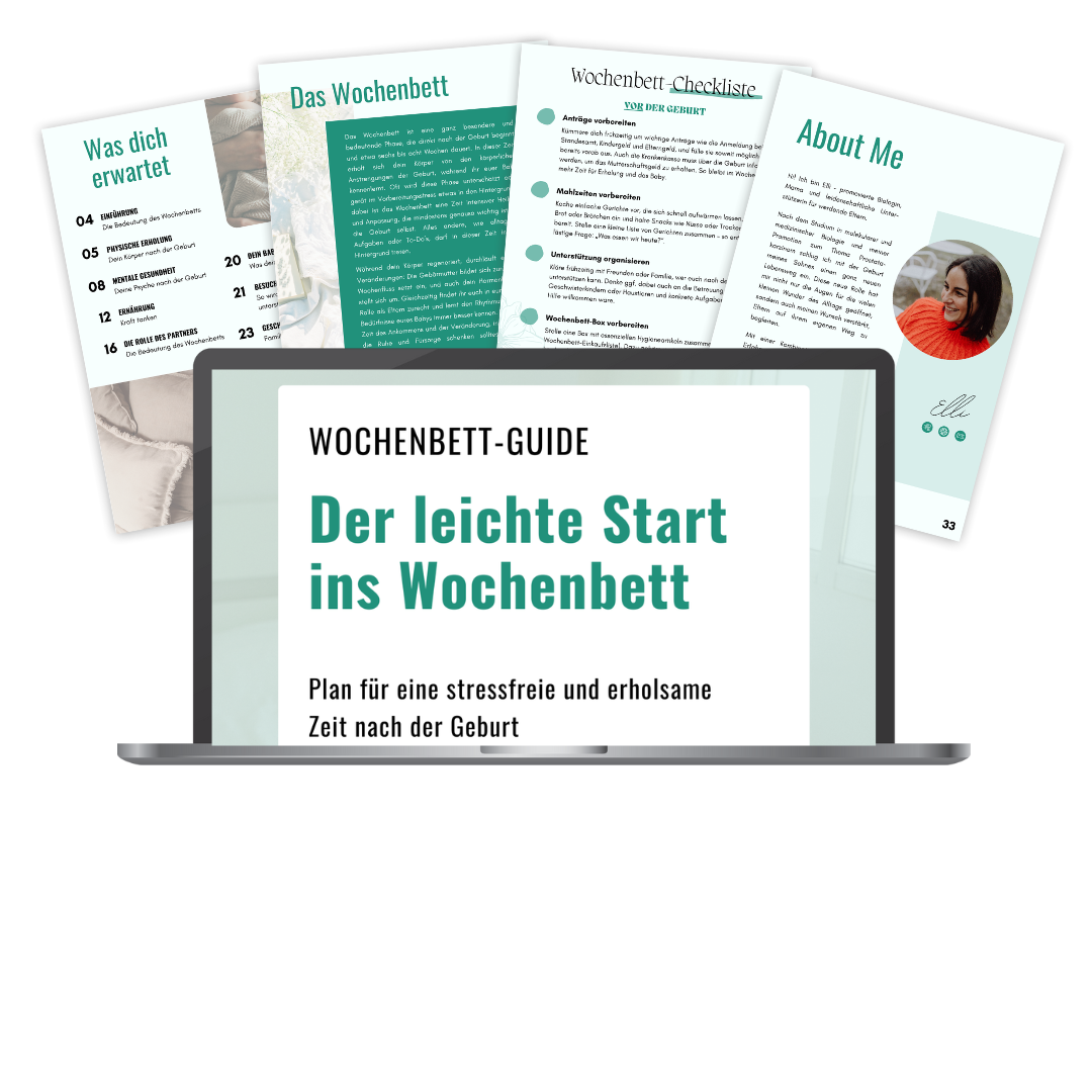 Du hast den Wochenbett-Guide bereits erhalten – jetzt geht’s ans Umsetzen! Ich hoffe, du kannst schon bald in die Tipps reinschauen und sie in deinen Alltag einbauen. Falls du noch Unterstützung brauchst, schaue gerne regelmäßig in deine E-Mails: Ich schicke dir hin und wieder Impulse rund um Geburtsvorbereitung, Wochenbett und die erste Zeit mit deinem Baby.